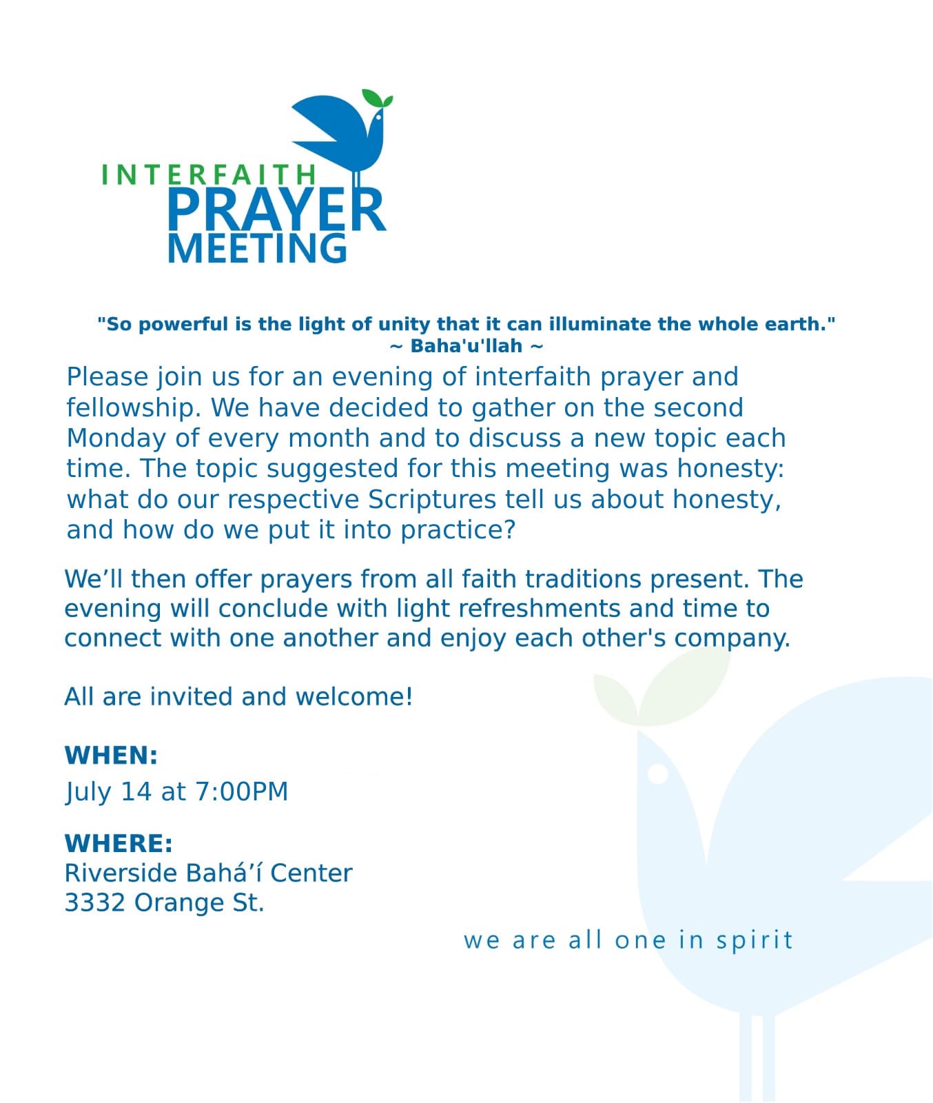 Our friends on the Riverside Interfaith Council shared an email this week about a Baha'i Interfaith Prayer meeting. It will be a diverse gathering with many different faith traditions represented-Christian and non-Christian. I you are interested in understanding how other faith traditions experience the movement of the Spirit, this might be an event worth attending.