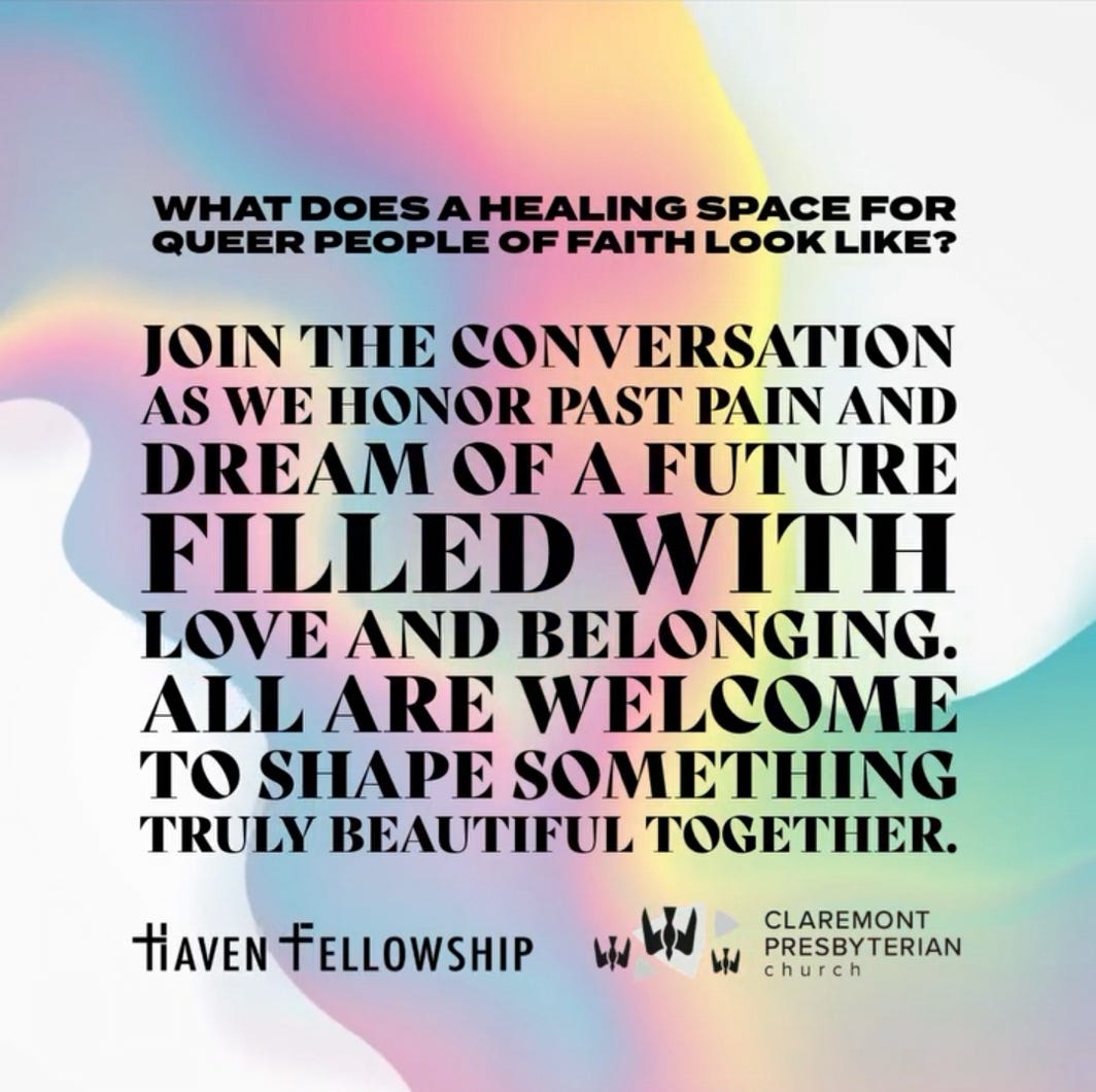 Pomona Valley Pride is hosting a one day spiritual retreat. Join us on Saturday, May 4th, along with Haven Fellowship, Claremont Presbyterian, and other faith communities as we talk about faith hope and love in the queer community. Many of us carry hurt from ways that we have felt excluded and othered by “church.” How can we work together to heal and do better for people in the future?