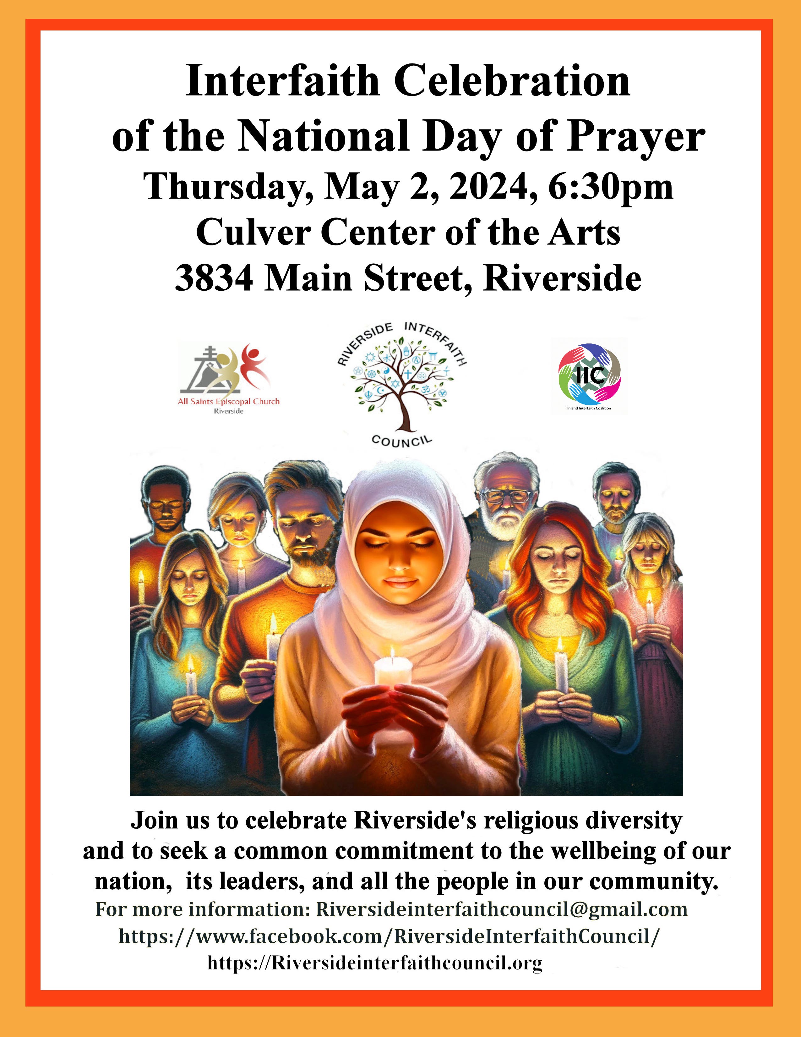 The next event coordinated by the Riverside Interfaith Council is a celebration of the National Day of Prayer. For more information please contact me or visit their website or social media link.