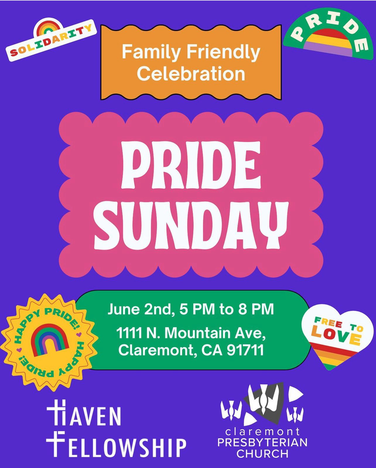 Haven Fellowship in Monrovia, and Claremont Presbyterian Church are coming together to host a family friendly Pride event. It’s going to be fun, and it’s a great way for us to get to know some of our neighbors in the wider community! No registration is necessary. All are welcome!